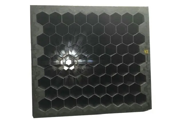用于湿式电除尘(雾)器的导电玻璃钢阳极管多为正六边形规格,管内切圆直径250mm~400mm,管长可达6米,管壁厚约3mm。阳极管模块由若干根正六边形管组合在一起组成沉淀极。